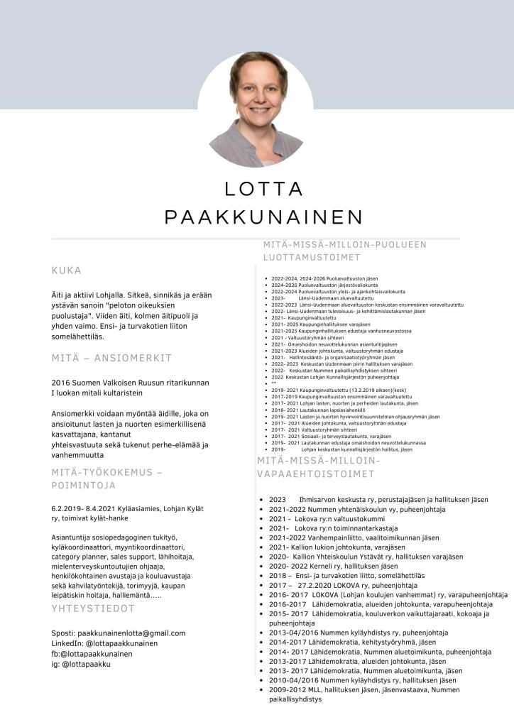 2017 – 27.2.2020 LOKOVA (Lohjan koulujen vanhemmat) ry, puheenjohtaja